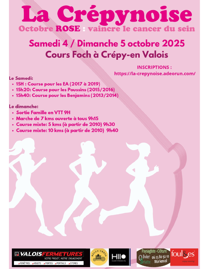 Dans le cadre d’Octobre Rose, la Crépynoise est organisée le week-end du 4 et 5 octobre 2025 à Crépy-en-Valois.